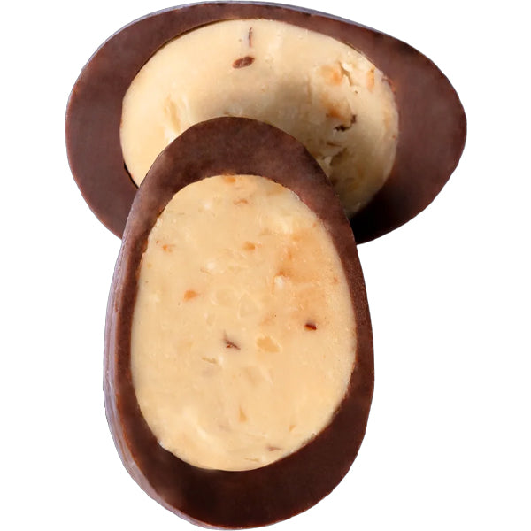 Ingredients: Filling (maple sugar (11.3%), inulin, cocoa butter, coconut oil, hazelnut (5%), tigernut flour (2.3%), sea salt (fleur de sel) (0.3%), soy lecithin, vanilla bean), chocolate (cocoa mass, maple sugar (16.8%), cocoa butter, tigernut flour (5%), soy lecithin). [Cacao solids 55%]. Contains: Hazelnut, Soy May be present: Almond, Milk